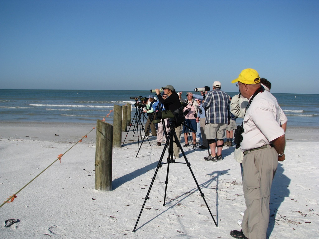 Birders respecting the sensitive areas by staying outside of the roped-off nesting area and observing birds from a distance with binoculars and spotting scopes.