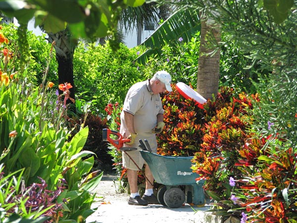 Further, I’d like to point out that even though condos are often an eyesore, and frequently have little in the way of foliage and trees around them, a fine example of stewardship exists right above the beach in front of those Upham Beach condos by the jetty. A beautiful and peaceful garden is lovingly tended by the condominium residents and is open to the public. The gentleman below welcomed me into the garden as he was going about his work in the hot August sun.