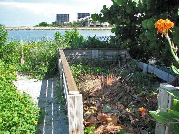 Notice also the use of a compost bin to recycle garden waste (below). Sunset beach is visible on the other side of Blind Pass.