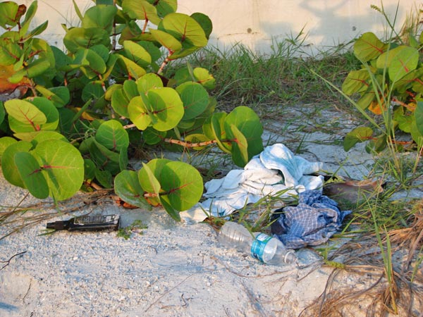 To its credit, Suncoast Surfrider Foundation, under the direction of Mike Meehan, frequently stages cleanups of this area. A couple of weeks after the last cleanup, I came back to Upham to find the mess pictured in the photos. In about 10 minutes, right on the beach in front of the aforementioned condominiums, I picked up a full 13 gallon trash bag of litter.