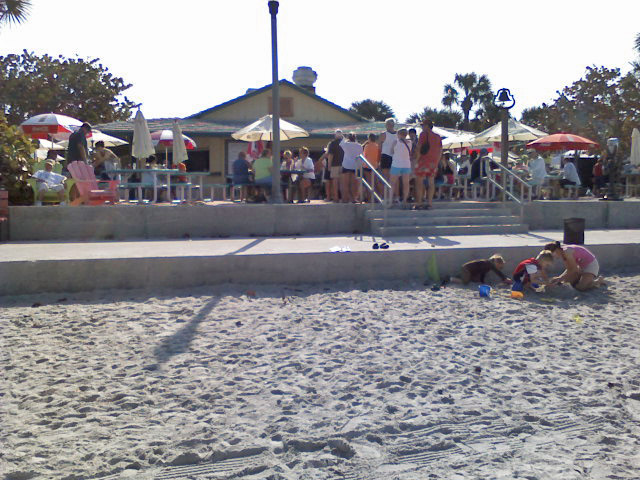 Pass-A-Grille Beach hosts a Saturday morning art fair / market during the cooler season, which brings a lot of folks down to the beach. The Paradise Grille is the beach concession serving all those hungry beach lovers. As you can see, there was a line stretching from the counter all the way back to the beach. Note the sunset bell in silhouette just to the right of the concrete steps.
