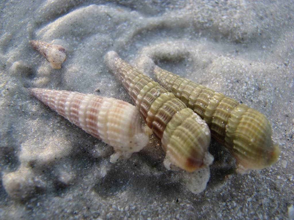 The very low tide this morning on Sanibel Island exposed millions of Common Atlantic Augers (Terebra dislocata). Here's a close-up look at several of them.