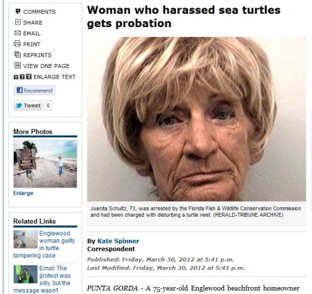 Juanita Schultz, an elderly Englewood beachfront homeowner, is known to call law enforcement to chase beachgoers off her beach, which she believes extends all the way to the water–even going so far as to give the sea turtle volunteers a hard time. Apparently her angst got the better of her, and according to the Herald Tribune: